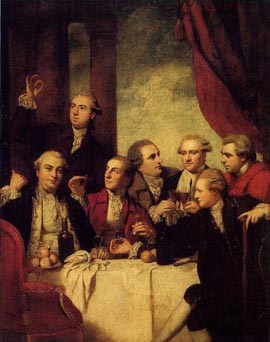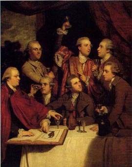 Estos son dos cuadros de Sir Joshua Reynolds, de 1777-79, miembro también del club, que en el primero representa a un grupo de dilettanti, observando un vaso griego y consultando un libro de grabados en el que aparece reproducido, mientras otros valoran las cualidades de un vino. En la segunda imagen, algunos miembros observan unas joyas.