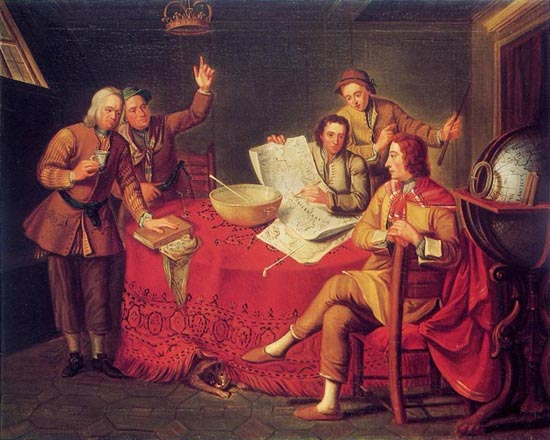 La imagen muestra a Gustavus Hamilton (1710-1746), segundo vizconde de Boyne, y los compañeros con los que hizo su Tour entre 1730 y 1731. Aparentemente, se encuentran en la cabina del barco que les había de traer de vuelta, desde Venecia. El cuadro es del pintor veneciano Bartolomeo Nazari (1693-1758).