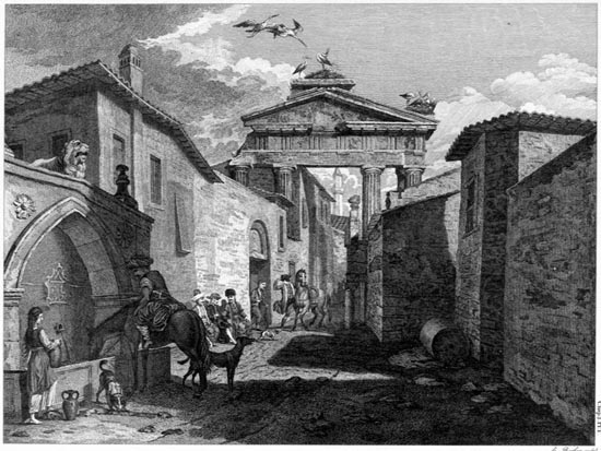 Ésta es la primera lámina del primer libro, La vista de la ciudad en ruinas de Palmyra. El libro es una serie de láminas, precedidas por un texto introductorio del poeta Homero. Esta lámina muestra una imagen del conjunto, un paisaje de la ciudad, con un cierto carácter pintoresco, por la ambientación y las sombras.