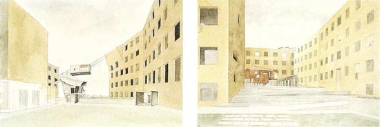 Así pues, Holl parece más interesado en explicar los jardines interiores y las estructuras ligeras, que los bloques de apartamentos, que es en realidad en lo que consiste básicamente su proyecto: en la construcción de doscientas viviendas. Más adelante veremos por qué.