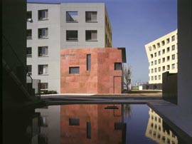 El paso siguiente fue la inserción -en la regularidad del complejo residencial- de seis estructuras ligeras y “activas”, como elementos de ruptura. Distribuidas por toda la extensión de la formación ortogonal de cinco bloques que ocupa el solar, estos pequeños pabellones están concebidos como una serie de episodios en perspectiva, con una finalidad muy concreta: captar la atención, atraer la mirada.