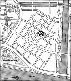 sólo están dibujados los perímetros de las manzanas, marcando así el límite con la calle. No tenemos ninguna referencia de cómo son los edificios adyacentes al proyecto. Ni siquiera de si los hay (Makuhari es una ciudad nueva, situada sobre un terreno artificial dragado en la costa