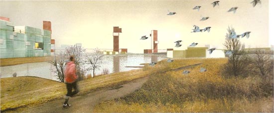 17. Steven Holl, Conjunto residencial Toolenburg-Zuid (concurso): combinación de fotografía, acuarela y renderizado