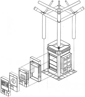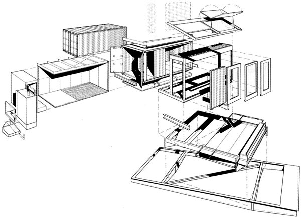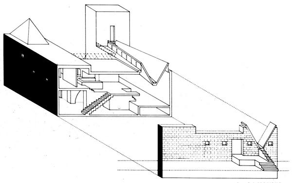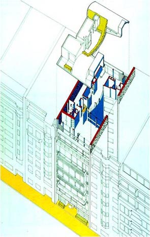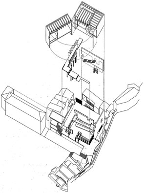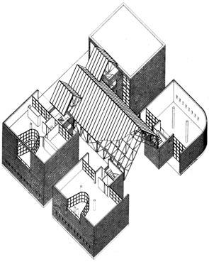 Talvez sea ésta la razón por la que, a menudo, se utiliza este tipo de proyección para mostrar los edificios como si fueran objetos sin peso, que se pueden manipular para mostrarlos por dentro: levantando el edificio para verlo por debajo, seccionandolo y eliminando una parte, descomponiéndolo en partes para mostrarlas separadas, o haciendo que una parte sea transparente. La principal razón de estas manipulaciones es mostrar el edificio por dentro: lo que no se ve por fuera y que no se muestra suficientemente en una sección. Un objetivo que se consigue con operaciones que conllevan una pérdida de la imagen global del edificio. Trataremos ahora estas manipulaciones, empezando por este primer tipo. |