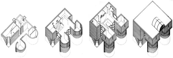 Cuando lo que se intenta representar es un conjunto de elementos similares, compuesto por varias plantas, un recurso habitual para mostrarlas todas en un mismo dibujo es el de este ejemplo. El arquitecto ha aprovechado que los cuatro volúmenes de los ángulos eran similares para mostrar las diferentes plantas del edificio, eliminando el techo en uno de ellos y una planta o dos en los demás. En este caso, la parte eliminada no se conserva desplazada, como en el caso anterior, porque el volumen que se ha conservado entero permite entender la forma inicial. |