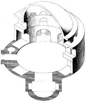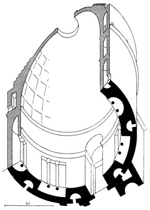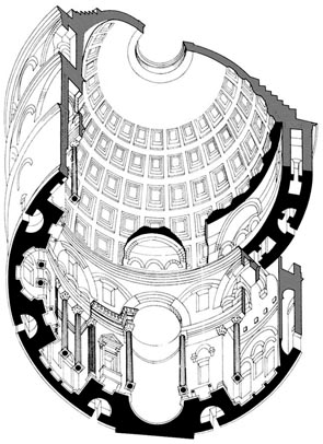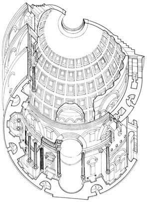En muchos casos, para entender mejor la forma interior de un edificio, es conveniente seccionarlo también verticalmente (el ejemplo que se muestra corresponde al Panteón de Roma). Esta axonometría muestra la planta del Panteón, y la secció. Como resultado, con una única imagen tenemos la representación conceptualmente completa del interior del Panteón. Realmente, no es una sección vertical sino dos medias secciones, resultado de dos planos de sección diferentes que coinciden en el eje central, para poder mostrar la sección de dos partes diferentes del muro de cerramiento. Como se puede ver, la sección horizontal y las verticales tienen un tratamiento diferente de las partes macizas, lo que favorece su lectura. Sólo se muestra medio edificio pero la simetría de la planta permite "reconstruir" la parte que falta. La imagen siguiente también corresponde al Panteón. |