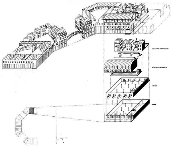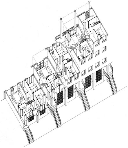 James Stirling y James Gowan, Queen's College, St-Clements, Osford, 1966-1971, axonometría.