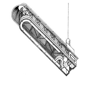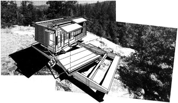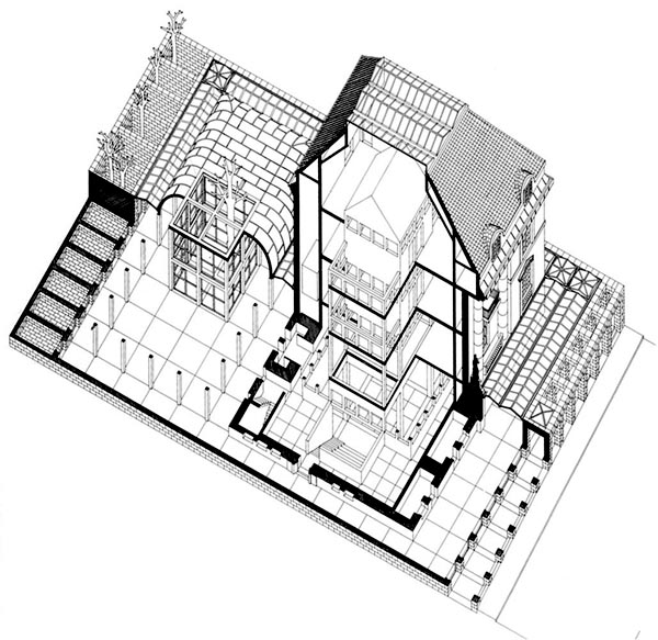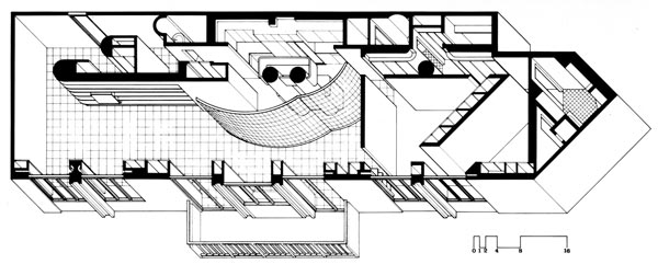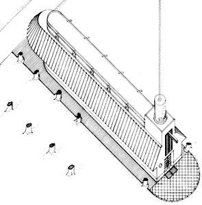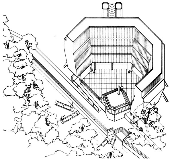 Esta es una axonometría similar a la del ejemplo anterior. Es el pabellón de una exposición en un parque. El arquitecto ha querido mostrar que hay árboles alrededor pero para evitar que estos taparan el edificio los ha dibujado como si estuvieran cortados. El dibujo muestra la forma de la cubierta y la franja de pavimento que rodea al edificio. Para poder mostar la parte interior que aquí no se ve, el arquitecto hizo también la siguiente axonometría. |