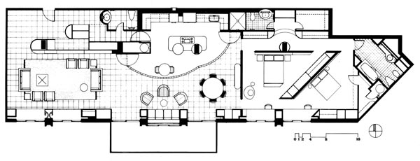 No hay que olvidar que la axonometría es eficaz para mostrar la volumetría del edificio, pero no para sustituir a los otros tipos de proyección. Si lo que se pretende mostrar sólo es la distribución interior, una simple planta es una solución mejor que la axonometría de esta misma planta. El siguiente ejemplo, de la axonometría de la planta de un apartamento permite, permite entender esto. |