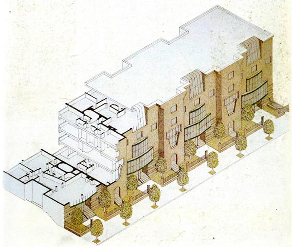 En el ejemplo siguiente, se ha aprovechado que se trata de una agrupación en hilera de bloques idénticos para mostrar la distribución interior del primer piso y del último. En este caso, la sección vertical se ha dejado blanca, para que no se confunda con la horizontal.