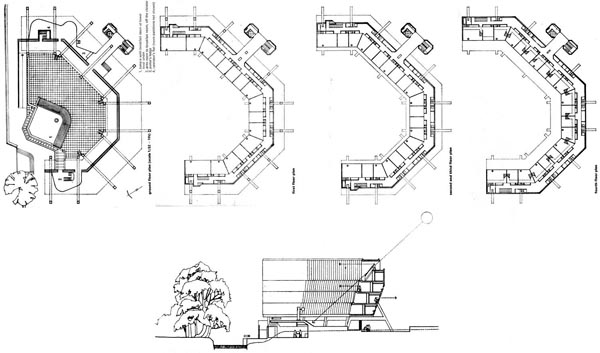 J. Stirling y J. Gowan, Queen's College, St-Clements, Osford, 1966-1971, Plantas y sección.